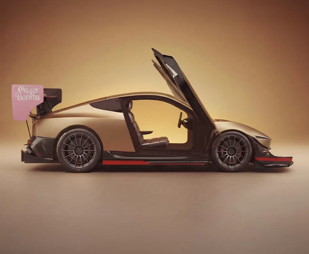 So the tiny robotaxi ended up with a giant carbon-fiber rear wing with dual-plane endplates, a front splitter assembly, a full carbon diffuser, and canards. The design also keeps the butterfly doors. A pink Casa Bonita graphic sits on the rear wing, which rises high above the tail. The body wears a gold finish, though only in digital form.